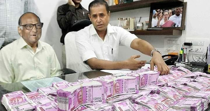 राष्ट्रवादी काॅंग्रेस पार्टीचे प्रमुख शरद पवार आणि राज्याचे गृहमंत्री अनिल देशमुख यांचा एका फोटो व्हायरल होत आहे. या फोटोत दोघांसमोर दोन हजार रुपयांच्या नोटांची बंडले आहेत. शिवाय शेल्फमध्ये सोनिया गांधी यांचा फोटो देखील आहे दावा केला जात आहे की, हप्ता वसुलीतून मिळालेली रक्कम दोघे मोजत आहेत.