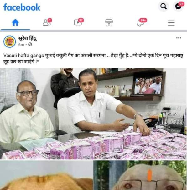 अशातच शरद पवार आणि अनिल देशमुख यांचा पैसे मोजतानाचा हा फोटो व्हायरल झाला आहे. हा फोटो हिंदी पोस्टमध्ये शेअर करण्यात आला आहे. यात म्हटले आहे की, Vasuli hafta gangs मुम्बई वसूली गैंग का असली सरगना… टेड़ा मुँह है… ये दोनों एक दिन पूरा महाराष्ट्र लूट कर खा जाएंगे l (मराठी अनुवाद- मुंबई वसुली गॅंगचा खरा सूत्रधार, वाकडं तोडं आहे… हे दोघे एक दिवस महाराष्ट्राला लूटून खातील.)