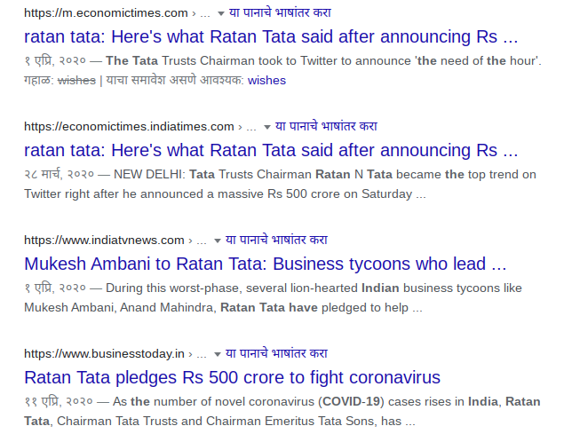 रतन टाटा यांनी मार्च महिन्यात 1500 कोटींची मदत करणार असल्याचे म्हटले होते. त्यावेळची बातमी देखील आम्हाला टाईम्स आॅफ इंडियाच्या वेबसाईटवर आढळून आली मात्र या बातमीत देखील रतन टाटा यांनी आपली सगळी संपत्ती भारत कोरोनामुक्त होण्यासाठी देण्यास तयार असल्याचे म्हटल्याचा उल्लेख नाही.