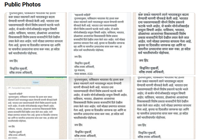 गुप्तचरानुसार, पाकिस्तान भारतावर थेट हल्ला करू शकत नसल्याने त्याने भारताकडून बदला घेण्याची मागणी चीनकडे केली आहे. भारतात दमा पसरवण्यासाठी चीनने विशेष प्रकारचे फटाके भरले आहेत, जे कार्बन मोनोऑक्साईड वायूला विषारी आहेत. याशिवाय, भारतात, डोळ्यांच्या आजारांच्या विकासासाठी विशेष प्रकाश सजावटीचे दिवे देखील तयार केले जात आहेत. पारो मोठ्या प्रमाणात वापरला गेला आहे, कृपया या दिवाळीत जागरूक रहा आणि या चायनीज उत्पादनांचा वापर करू नका. हा संदेश सर्व भारतीयांपर्यंत पोहोचवा. जय हिंद