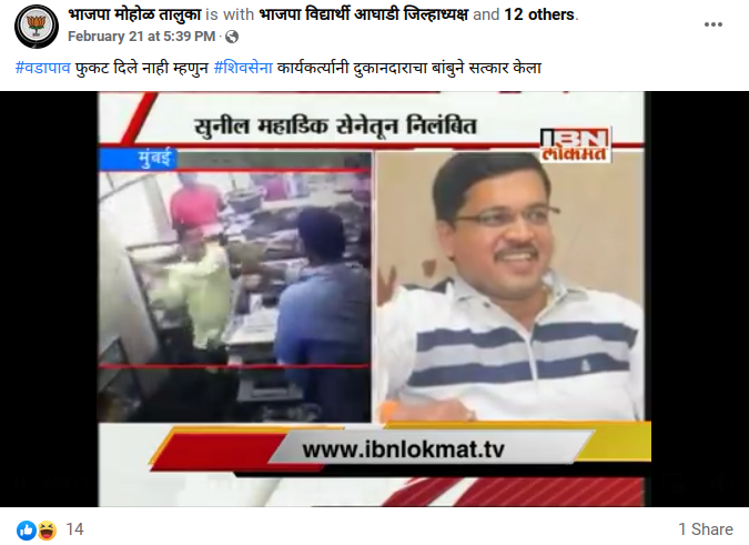 पोस्टमध्ये म्हटले आह की, विलेपार्ले येथे वडापाव फुकट दिले नाही म्हणुन शिवसेना कार्यकर्त्यानी दुकानदाराचा बांबूने सत्कार केला..