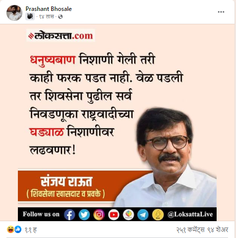 अशा पद्धतीने आमच्या पडताळणीत हे स्पष्ट झाले की, लोकसत्ताच्या नावाने शेअर केल्या जाणाऱ्या फोटोतील संजय राऊत यांचे विधान एडिट केलेले आहे. शिवसेनेचे खासदार व प्रवक्ते संजय राऊत यांनी “धनुष्यबाण निशाणी गेली तरी काही फरक पडत नाही. वेळ पडली तर शिवसेना पुढील सर्व निवडणूका राष्ट्रवादीच्या घड्याळ निशाणीवर लढवणार!” हे विधान केलेले नाही.