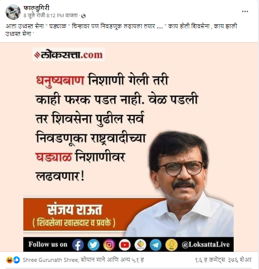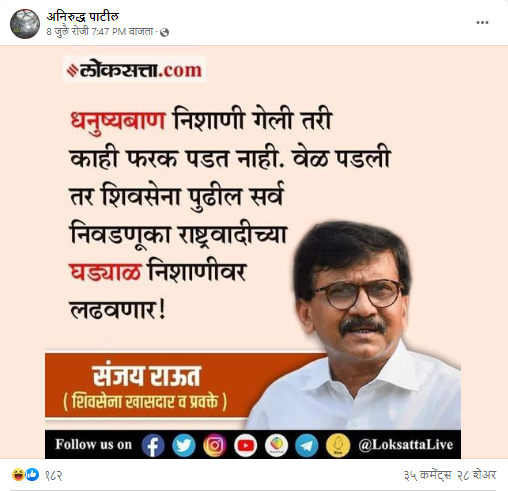 याविषयी अधिक माहिती जाणून घेण्यासाठी आम्ही व्हायरल पोस्टमधील ‘धनुष्यबाण निशाणी गेली तरी काही फरक पडत नाही. वेळ पडली तर शिवसेना पुढील सर्व निवडणूका राष्ट्रवादीच्या घड्याळ निशाणीवर लढवणार !’ हे विधान गुगलवर टाकून शोधले. तेव्हा आम्हांला ८ जुलै २०२२ रोजीची लोकसत्ताची एक बातमी मिळाली. तेव्हा आम्हांला मूळ फोटोतील संजय राऊत यांचे विधान व बातमीचे शीर्षक एकच असल्याचे आढळले.