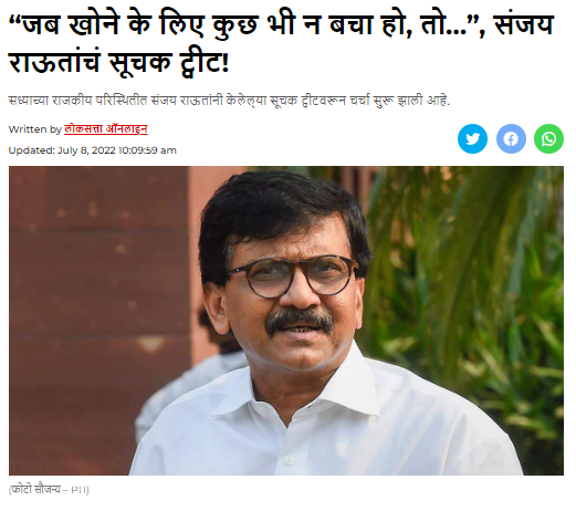 ८ जुलै २०२२ रोजी शिवसेनेचे खासदार व प्रवक्ते संजय राऊत यांनी केलेले ट्विट