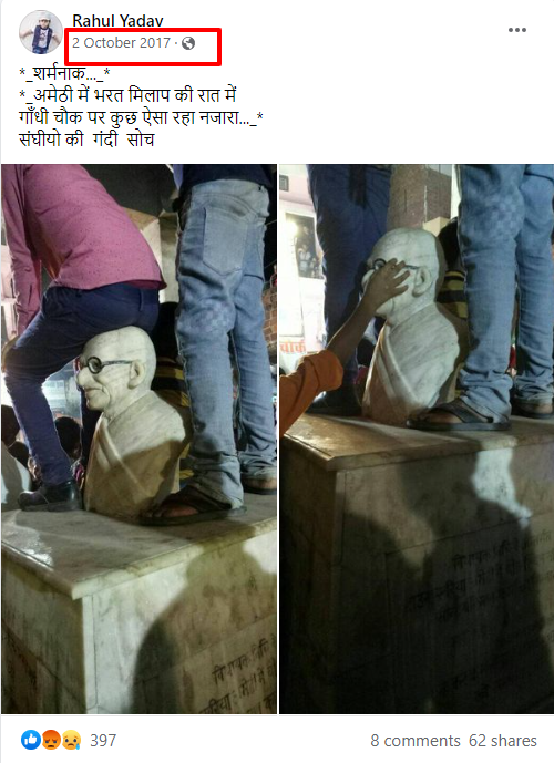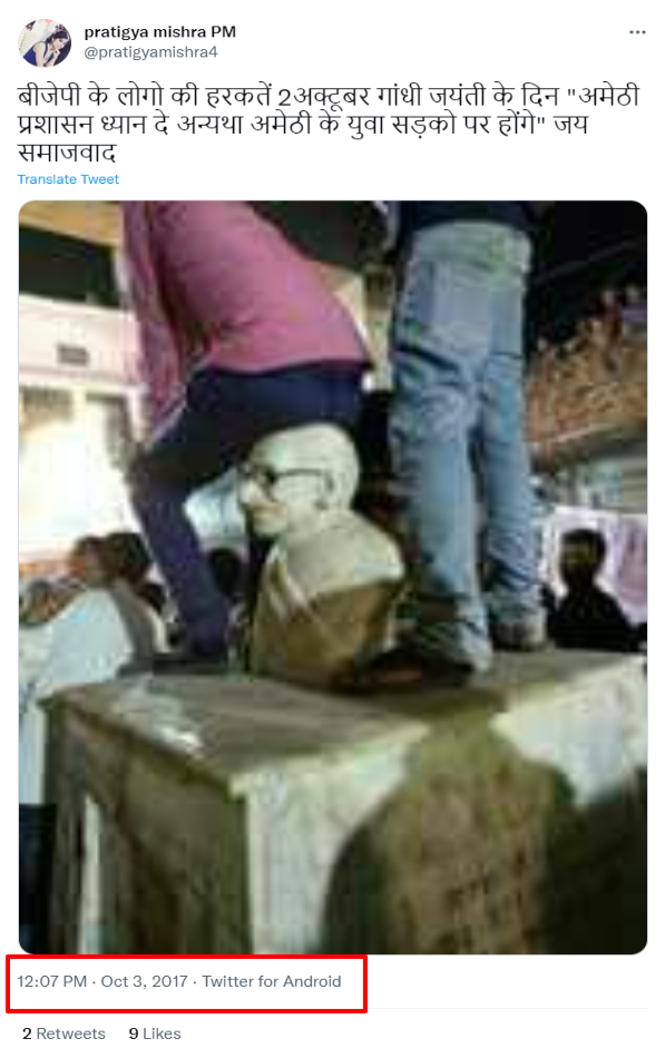 पण हा फोटो यांडेक्सवर रिव्हर्स सर्च केल्यावर आम्हांला ३ ऑक्टोबर २०१७ ची एक ट्विटर पोस्ट मिळाली. त्या पोस्टमध्ये व्हायरल फोटो दिसत आहे. जी उत्तर प्रदेश अमेठीची सांगितली जात आहे. त्यात हे देखील लिहिलंय की, गांधीजी यांच्या मूर्तीवर बसलेला व्यक्ती भाजपचा समर्थक आहे.