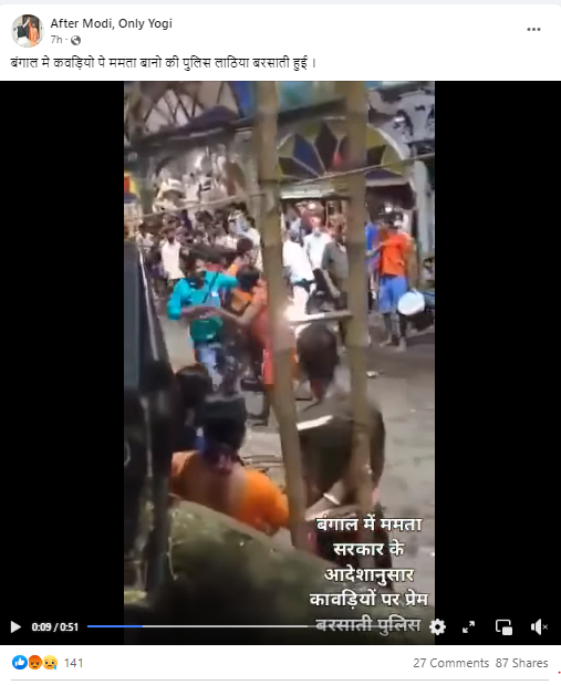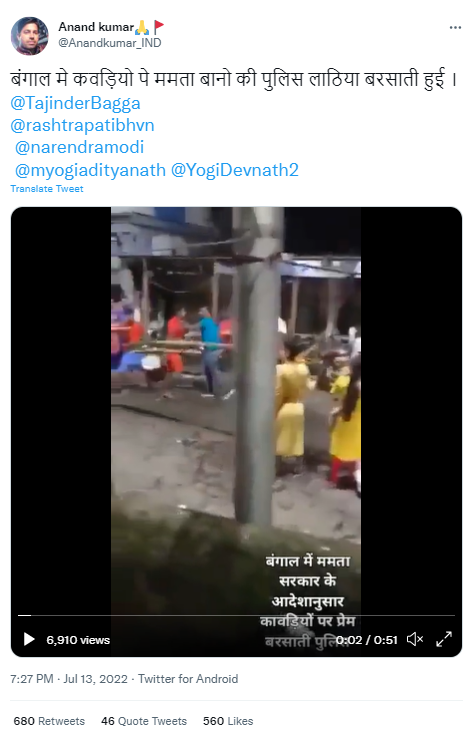 ट्विटरवर काही युजर हा व्हिडिओ शेअर करत दावा करत आहे की, पश्चिम बंगाल पोलिसांनी कंवर यात्रेतील भाविकांना मारहाण केली.