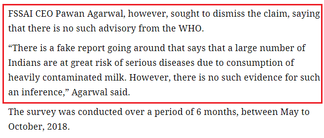 या व्यतिरिक्त आम्हांला द न्यू इंडियन एक्सप्रेसची १३ नोव्हेंबर २०१८ ची एक बातमी मिळाली. त्यात एफएसएसएआयचे सीईओ पवन अग्रवाल यांनी सांगितले की,”दुधाचे सेवन केल्यामुळे भारतीयांना गंभीर आजार होण्याचा एक खोटा अहवाल फिरत आहे. पण त्याला कोणताही पुरावा नाही.”