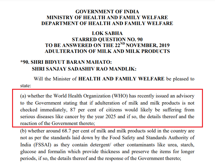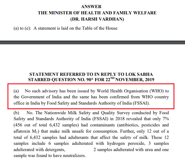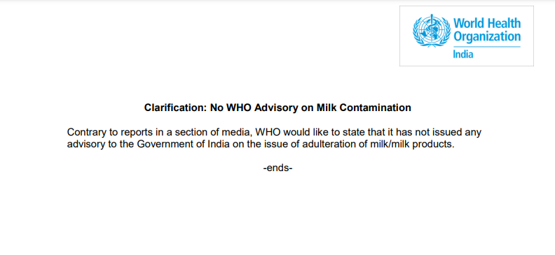 त्यावेळी आम्हांला डब्ल्यूएचओने दिलेले एक स्पष्टीकरण मिळाले. त्यात त्यांनी स्पष्टपणे म्हटलंय की,”माध्यमांच्या काही अहवालासंदर्भात डब्ल्यूएचओ हे सांगू इच्छितो की, दूध/दुग्धजन्य पदार्थांच्या भेसळीबाबत आम्ही भारत सरकारला कोणताही सल्ला दिलेला नाही.”
