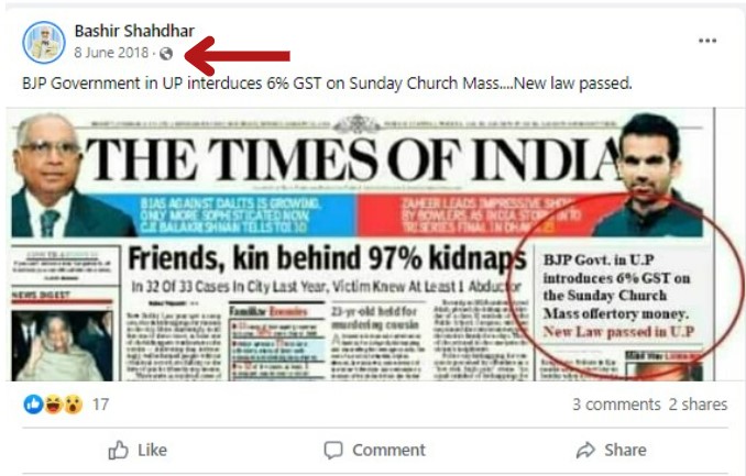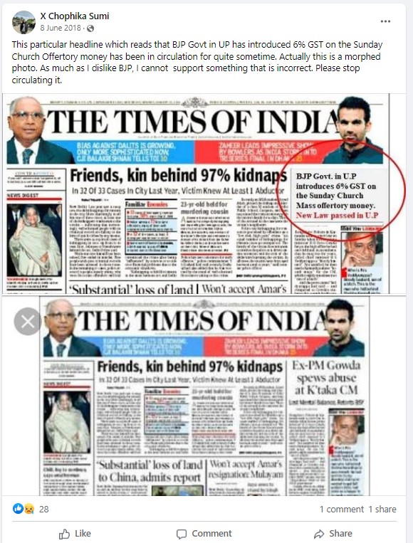 The search on Facebook also led us to a post by @chophikas, dated June 8, 2018. Displaying the viral image along with another Times of India newspaper clipping, the post said, “This particular headline which reads that BJP Govt in UP has introduced 6% GST on the Sunday Church Offertory money has been in circulation for quite sometime. Actually this is a morphed photo…”