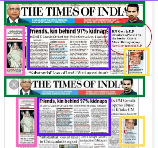 A closer look at both the images led us to conclude that, leaving the headline about 6% GST, the newspaper clippings were identical. Instead of “BJP Govt. in UP introduces 6% GST on the Sunday Church Mass offertory money. New Law passed in U.P,” the headline in the second news clipping shared by user @chophikas read, “Ex-PM Gowda Spews Abuses at K’taka CM.” The font of this headline was also in sync with the stylesheet of the newspaper.