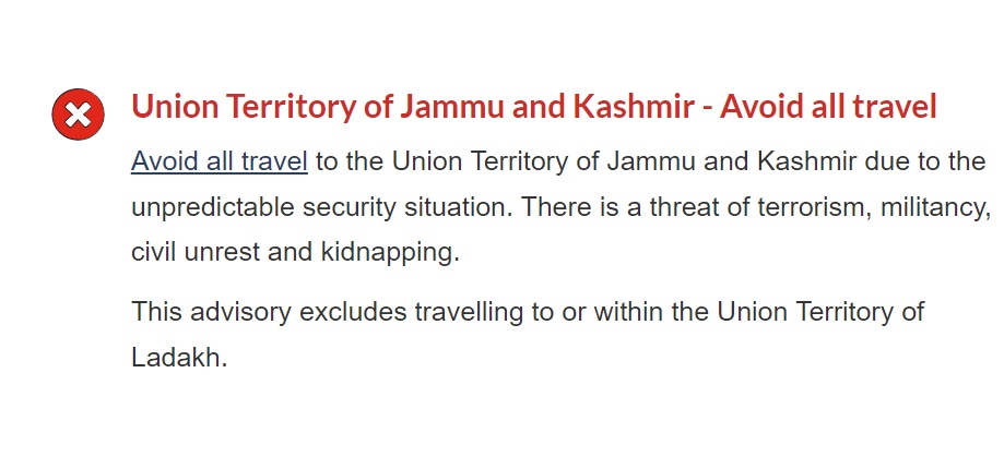 An earlier version of the page, archived on July 10, 2021 is carries a different text. “Avoid all travel to the states of Jammu and Kashmir, due to sporadic terrorist activity and violent demonstrations. This advisory excludes travelling to Ladakh via Manali, and air travel to Leh.”