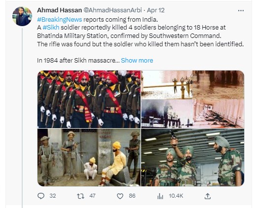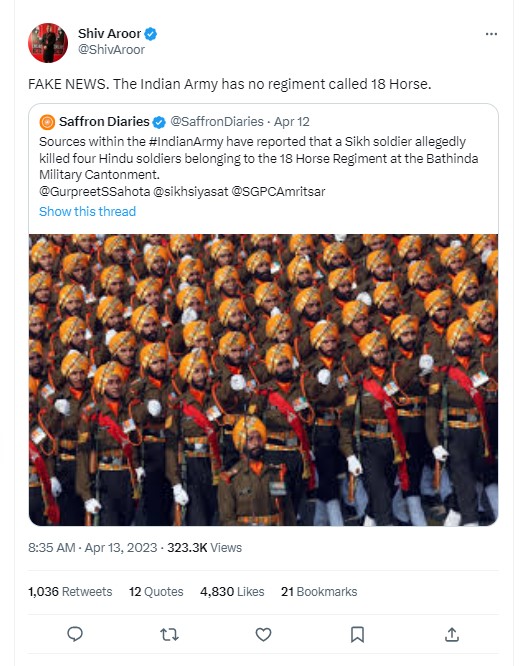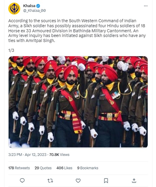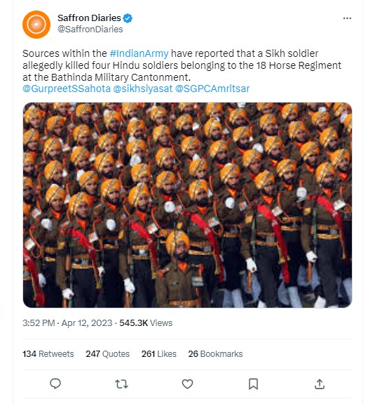 While the Indian army and Punjab police continue to probe the recent firing incident at Bathinda military station that killed four jawans, many twitter handles, including verified ones, “revealed” that the victims of the incident belonged to the 18 Horse Regiment and that “a Sikh soldier allegedly killed four Hindu soldiers”