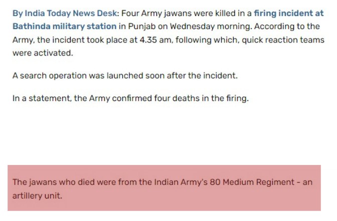 Further, a keyword search for “Bathinda” and “80 Medium Regiment” threw up a report by India Today, dated April 12, 2023, elaborating on the incident. It read, “The jawans who died were from the Indian Army’s 80 Medium Regiment – an artillery unit.”
