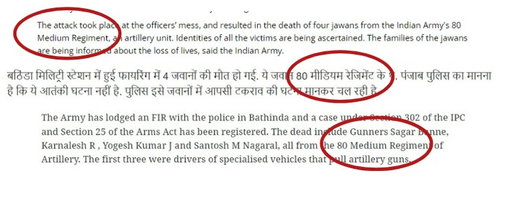 Viral claim that four soldiers of the 18 Horse Regiment died in the recent shootout at Bathinda cantt is misleading. The deceased belonged to the Indian Army’s 80 Medium Regiment – an artillery unit. Additionally, there is no 18 Horse Regiment in the Indian Army.