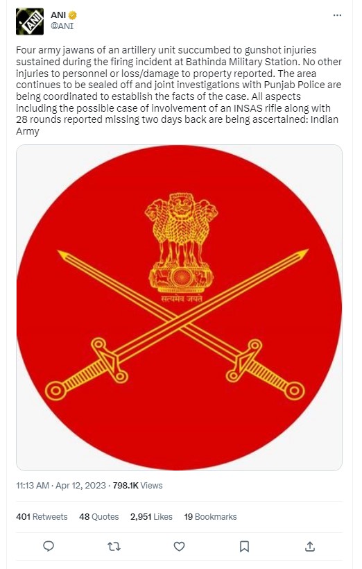 A keyword search for “Bathinda,” “army,” and “firing” on Google yielded a tweet by news agency ANI, dated April 12, 2023, detailing the incident. It stated, “Four army jawans of an artillery unit succumbed to gunshot injuries sustained during the firing incident at Bathinda Military Station. No other injuries to personnel or loss/damage to property were reported. The area continues to be sealed off, and joint investigations with Punjab Police are being coordinated to establish the facts of the case. All aspects, including the possible case of involvement of an INSAS rifle along with 28 rounds reported missing two days back, are being ascertained: Indian Army.”