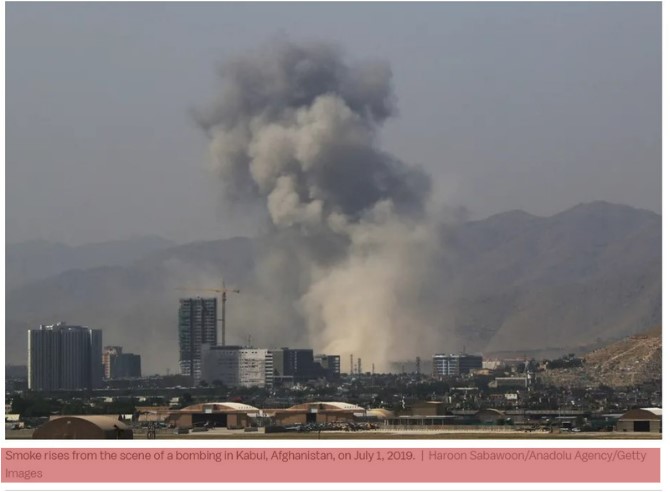 The caption of the image read, “Smoke rises from the scene of a bombing in Kabul, Afghanistan, on July 1, 2019.” It was credited to Haroon Sabawoon/Anadolu Agency/Getty Images.