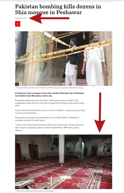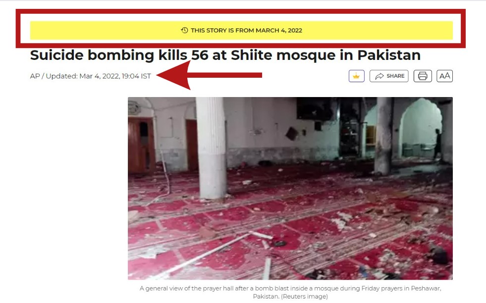 A Google reverse image search on the viral photograph led us to a report by BBC, dated March 4, 2022, titled ‘Pakistan bombing kills dozens in Shia mosque in Peshawar.’ The report carried the viral image with the caption, “The scene inside the building after the bombing,” and elaborated, “A bombing inside a mosque in the north-western Pakistani city of Peshawar has killed at least 56 people, medics say. A hospital spokesman said more than 190 people were wounded in the suspected suicide attack on the Shia mosque while Friday prayers were being held.”