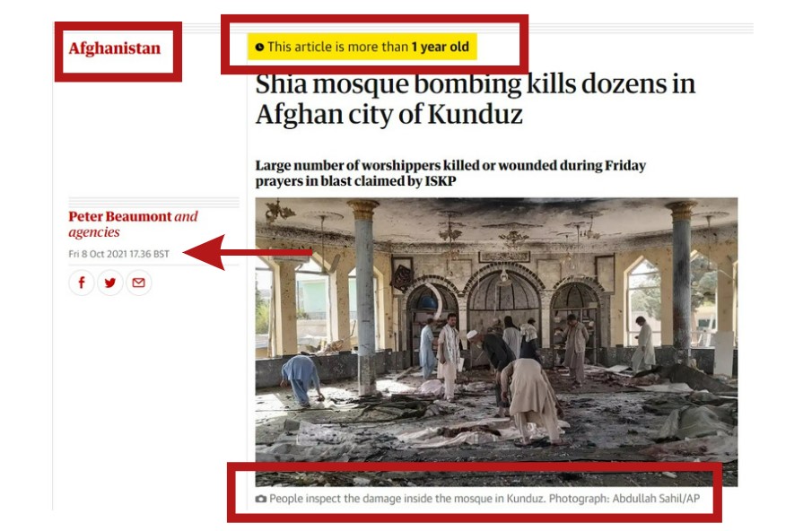 Following this, we conducted a keyword search for “Afghan Kunduz province,” &“ Mosque Blast 2021” which yielded a report by The Guardian, dated October 8, 2021. Carrying an image of the same complex, the report elaborated, “The attack was the most deadly in the country since a suicide bombing – also claimed by ISKP – at Kabul airport during the US-led withdrawal, which killed 13 US servicemen and 169 Afghans. Photos and video from the scene in Kunduz showed rescuers carrying a body wrapped in a blanket from the mosque to an ambulance.”
