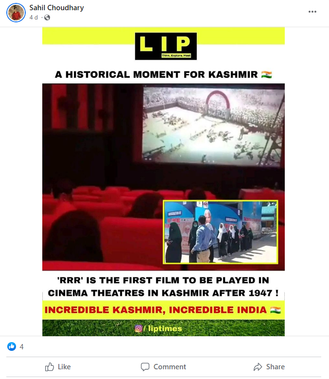 In this backdrop, different media houses and social media pages have claimed that ‘RRR’ Is The First Movie To be played in cinema theatres in Kashmir after 1947. Links to the posts can be seen here, here, here and here.