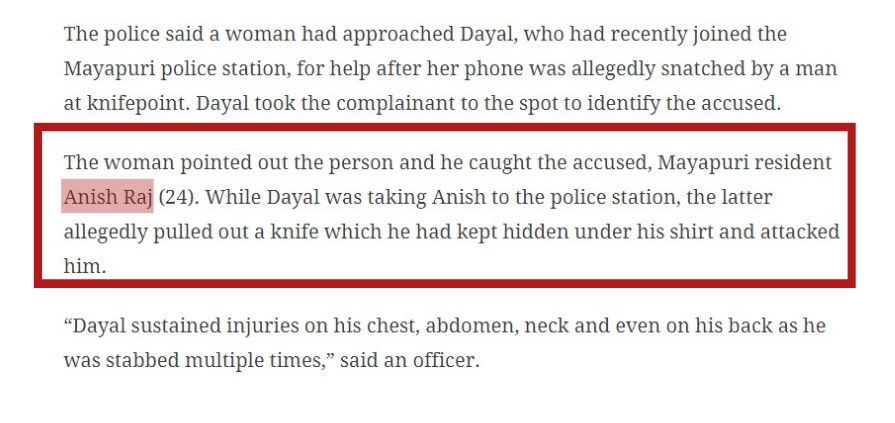 It further elaborated, “The police said a woman had approached Dayal, who had recently joined the Mayapuri police station, for help after her phone was allegedly snatched by a man at knifepoint. Dayal took the complainant to the spot to identify the accused. The woman pointed out the person and he caught the accused, Mayapuri resident Anish Raj (24). While Dayal was taking Anish to the police station, the latter allegedly pulled out a knife which he had kept hidden under his shirt and attacked him.”
