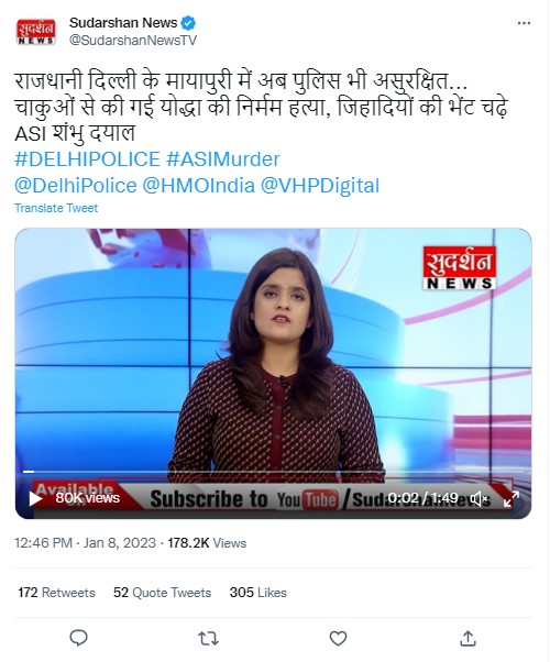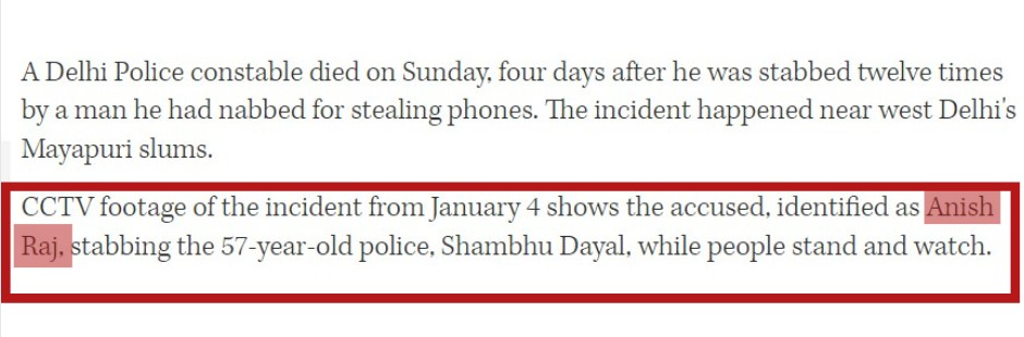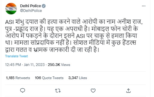 In a tweet dated January 11, 2023, the Delhi Police said, “The name of the accused who killed ASI Shambhu Dayal is Anish Raj, son – Prahlad Raj. He is a criminal. While the accused was being caught in a case of mobile theft, he attacked the ASI with a knife. The matter is not communal. Wrong and misleading information is being given by some handles in social media.”