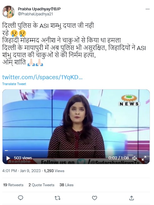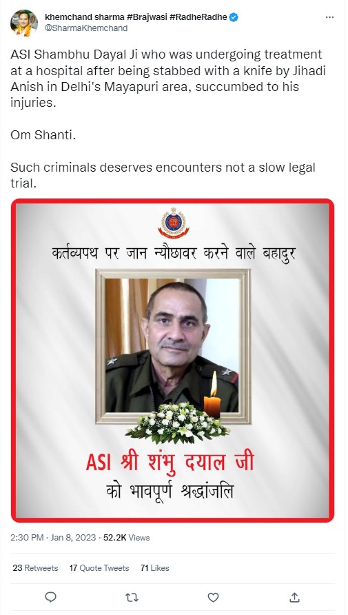 In a tweet dated January 8, 2022, BJP leader Khemchand Sharma said, “ASI Shambhu Dayal Ji who was undergoing treatment at a hospital after being stabbed with a knife by Jihadi Anish in Delhi’s Mayapuri area, succumbed to his injuries. Om Shanti. Such criminals deserves encounters not a slow legal trial. (sic)”