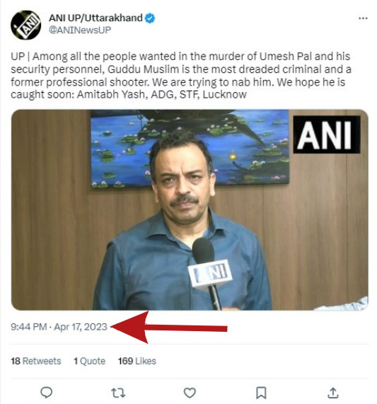 A Twitter search for “Guddu Muslim” & “UP STF” yielded a post by @ANINewsUP, dated April 17, 2023. The tweet stated, “Among all the people wanted in the murder of Umesh Pal and his security personnel, Guddu Muslim is the most dreaded criminal and a former professional shooter. We are trying to nab him. We hope he is caught soon: Amitabh Yash, ADG, STF, Lucknow”
