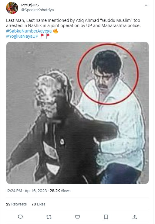 A day after the Atiq-Ashraf killing, multiple verified Twitter handles, including media person Aman Chopra, claimed that Atiq Ahmed’s aide Guddu Muslim had been arrested.