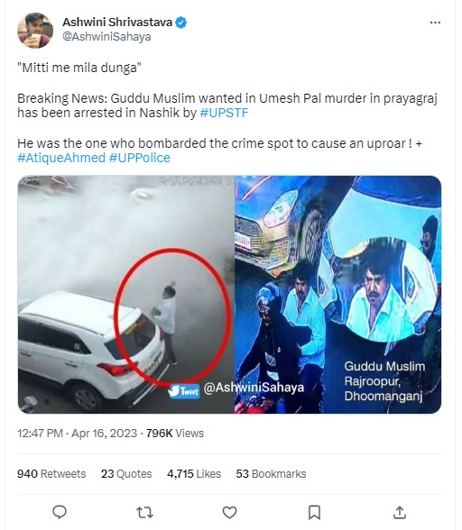 His alleged arrest was also reported by RSS-affiliate Organiser on April 16, 2023. It stated, “The Uttar Pradesh Special Task Force has caught Guddu Muslim from Nashik, an accused in the Umesh Pal case. This comes after gangster-turned-politician Atiq Ahmed and his brother Ashraf were shot dead on the night of April 15.”