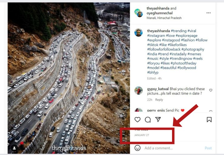 A Google reverse image search on the viral photograph led us to a post by Facebook community, @I.Love.Kullu.HP, dated July 5, 2022. Displaying the widely circulated photograph, the post stated, “Manali Roads now a day.. (sic).” The image was credited to the Instagram account of user @theyashhanda.