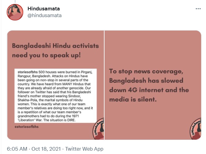 Several social media pages tweeted out videos and images, claiming to show attacks on Hindus in Bangladesh. These were not only shared on social media by several verified handles, including pro-right wing social media voices, but also cited as credible sources of information by the prominent news outlets in the country.