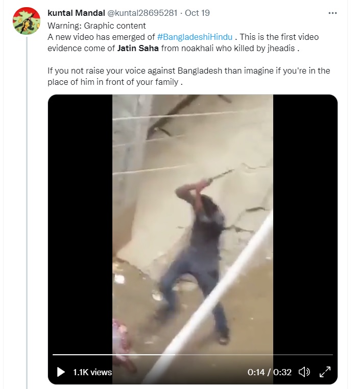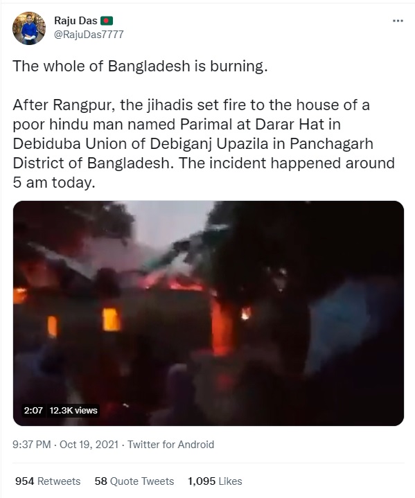 The tweet claimed that it was from violence hit Rangpur, where at least 60 Hindu homes were targeted by angry Islamist mobs, burning down at least 20 of them. An investigation by Newschecker has revealed that the video was actually from Tripura. Newschecker contacted Jyotish Ranjan Das, Divisional Fire Officer of Dhalai Division in Tripura, who confirmed that the video was from Tripura. “The report is false. It is a fire in a Durga Puja pandal in Tripura’s Dhalai district and not from Bangladesh as is being claimed,” he said.