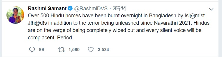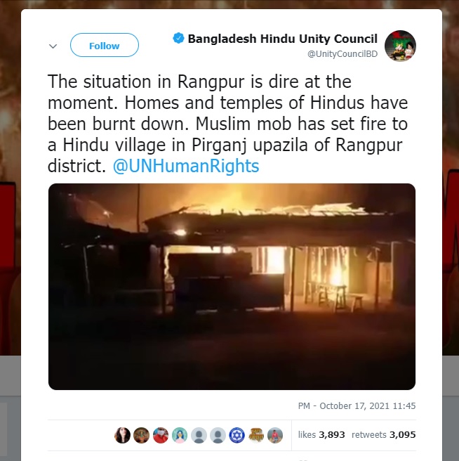 What sets apart the recent violence that took place against the Hindus in Bangladesh is how willing many twitter users were to share such posts and claims without due diligence. Pro-right commentator and former president of Oxford Students Union, Rashmi Samant is among those who shared a claim that over 500 Hindu homes were set on fire in Bangladesh’s Rangpur during the violence. The now deleted post had seen 1,500 shares and over 3000 likes in 2 hours. Here’s an archived copy of the tweet.