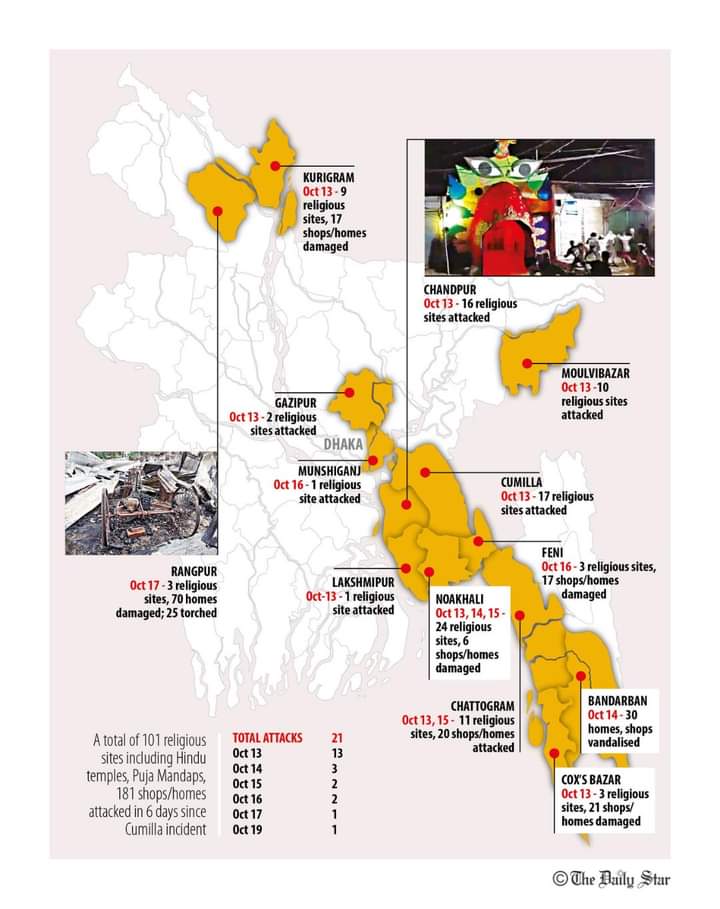 Authorities in Bangladesh confirmed to Newschecker that the total number of homes that were burned in Rangpur during the violence was 29. Lima Khanom, Duty officer at the Fire Service and Civil Defence control room says “We received reports of 29 house, 2 kitchen, 2 barnhouse, and 20 haystacks being set on fire in Rangpur.” Reports by Bangladeshi news outlet Daily Star also showed that a total of 101 Hindu religious sites including mandaps and temples, 181 shops/homes were attacked in the 6 days since the Cumila incident.
