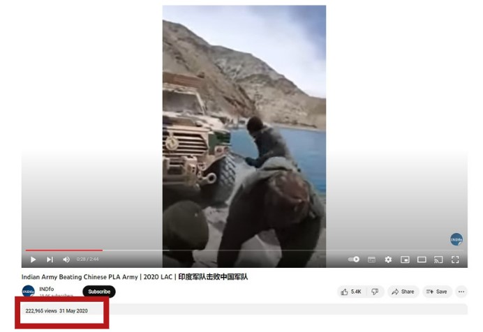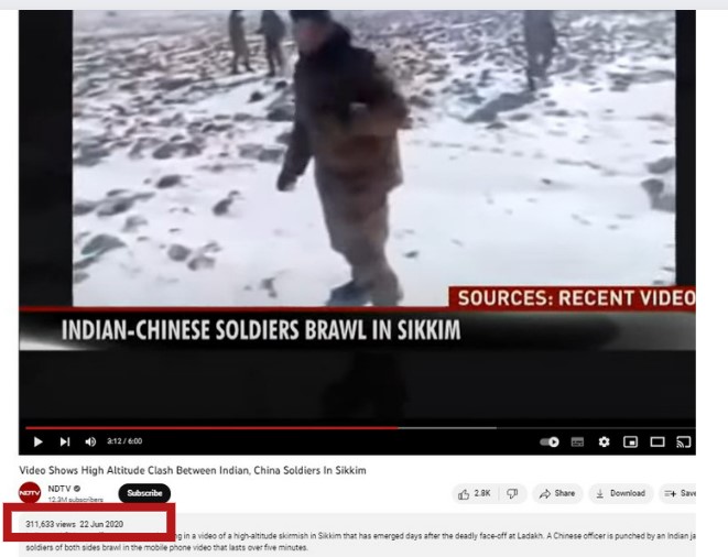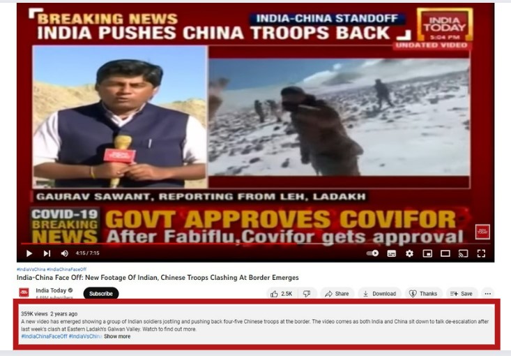 Another YouTube video by India Today, dated June 22, 2020 featured snippets from the viral clip. The description of the video read, “A new video has emerged showing a group of Indian soldiers jostling and pushing back four-five Chinese troops at the border. The video comes as both India and China sit down to talk about de-escalation after last week’s clash at Eastern Ladakh’s Galwan Valley.”