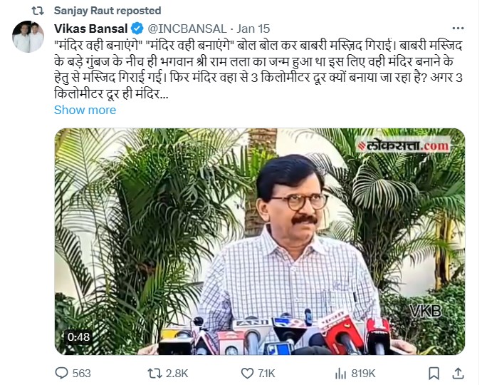 Shiv Sena (UBT) leader Sanjay Raut, was among the first to make the controversial claim that the Ram temple in Ayodhya was being built three kilometers away from where the Babri Masjid was destroyed. The claim made news and stirred a major controversy.