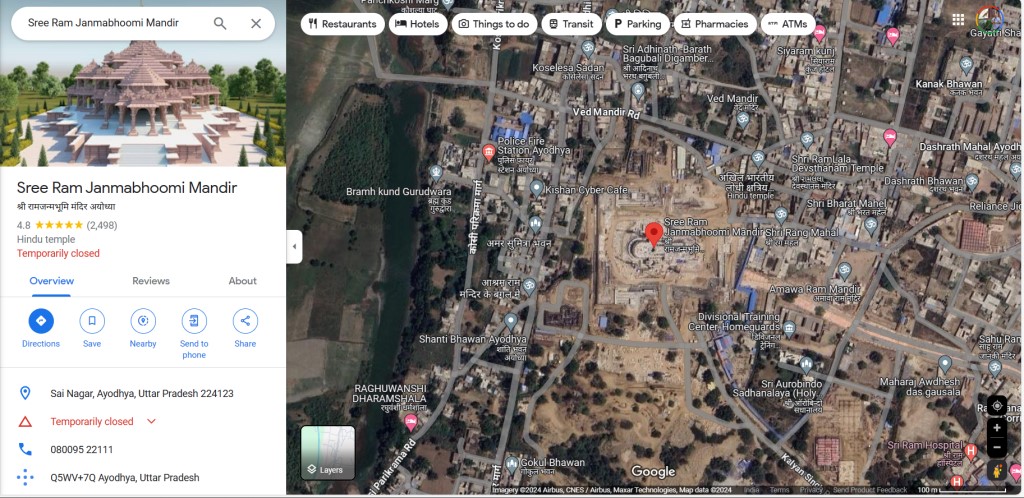 We used Google Map to find out more about the second location that was marked as ‘Babar masjid’ and found that it was the location of the Sita-Rama Birla Temple in Ayodhya.