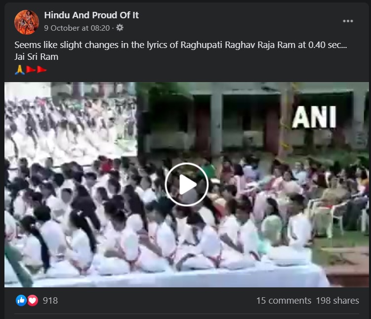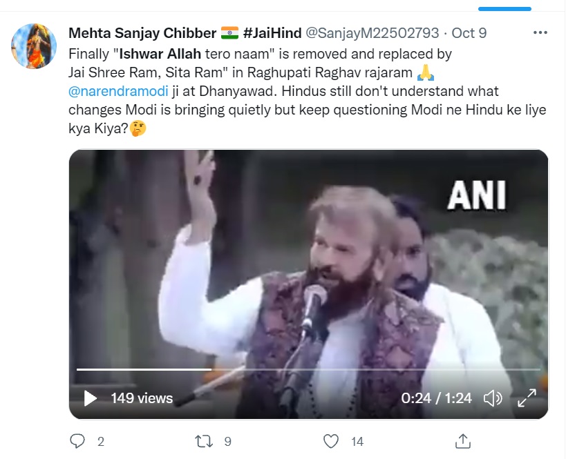 The video shows prominent people including the Prime Minister and the Vice president in the audience as Hans Raj Hans sings. Instead of the lines ‘Ishwar Allah Tero Naam’, the singer is heard repeating ‘Jai Shri Ram’ four times. The video, shared by @SheetalPronamo on Twitter, has received over 2,700 retweets and over 9,000 likes on Twitter at the time of publishing.