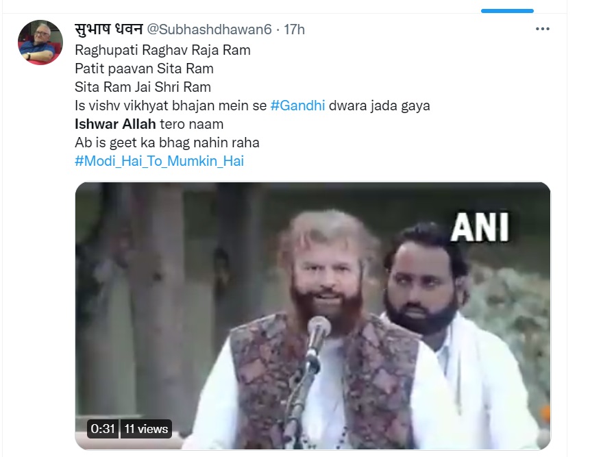 A keyword search on YouTube throws up the video ‘Hans Raj Hans Live on the Occasion of 152nd Birth Anniversary of Mahatma Gandhi || Raghupati’. Published on October 4, 2021, the video is almost 6 minutes long. 2 minutes 38 seconds into the video, the singer is heard singing the lines ‘Ishwar Allah Tero Naam, Sabko Sanmati De bhagwan’ keeping in line with the lyrics altered by Mahatma Gandhi.