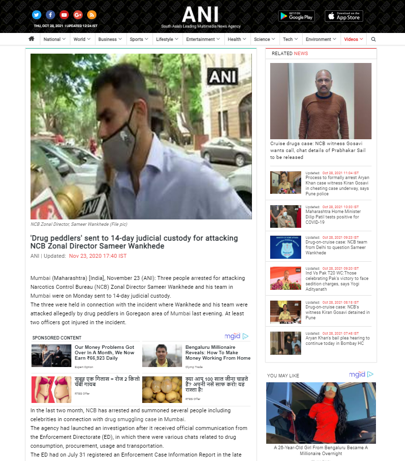 To investigate if the viral claim holds water, Newschcker ran a keyword search for, ‘Sameer Wankhede attacked by drug peddlers in Mumbai,’ and the result led us to several news reports from November 2020.
