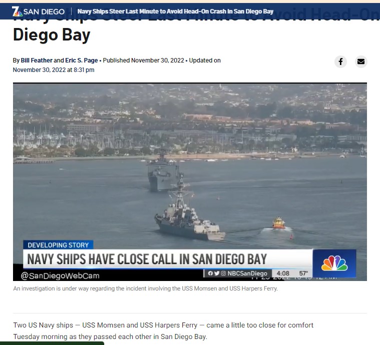 We found another report published by the ‘NBC San Diago’ titled, “Navy Ships Steer Last Minute to Avoid Head-On Crash in San Diego Bay” published on 30 November 2022. Relaying the same information, the report read, ‘a potentially close encounter unfolded as two US Navy ships, namely the USS Momsen and USS Harpers Ferry, passed each other in San Diego Bay. The incident occurred between North Island’s Ammunition Pier and the western tip of Shelter Island and was recorded by a webcam, subsequently leading to a Naval inquiry.’