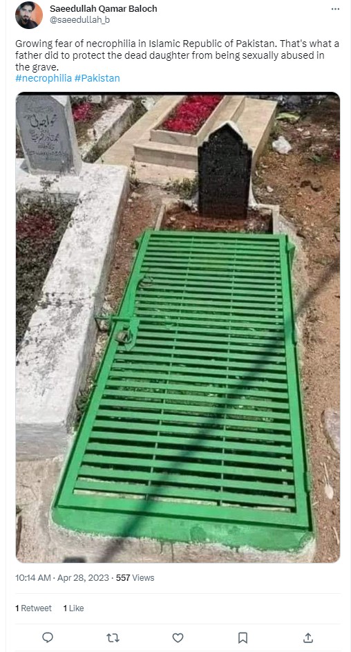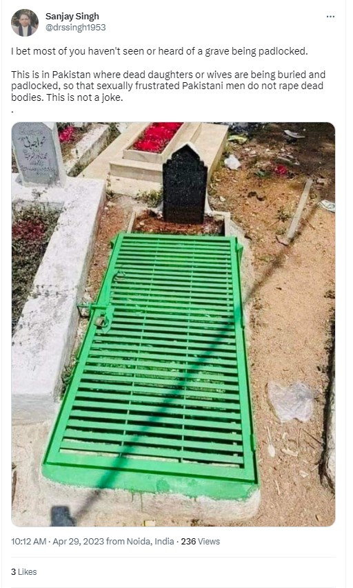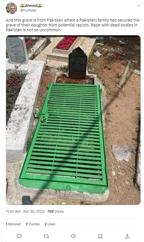 An image of a grave covered with a locked iron gate has gone viral on social media platforms. Users sharing the image alleged that it shows a grave from Pakistan, while adding that the parents of the deceased girl padlocked her grave to prevent the corpse from being raped. Multiple news outlets, including WION, ABP, OpIndia Hindi and news agency ANI, also made the claim, raising concerns over necrophilia in Pakistan. Newschecker found the claim to be untrue.