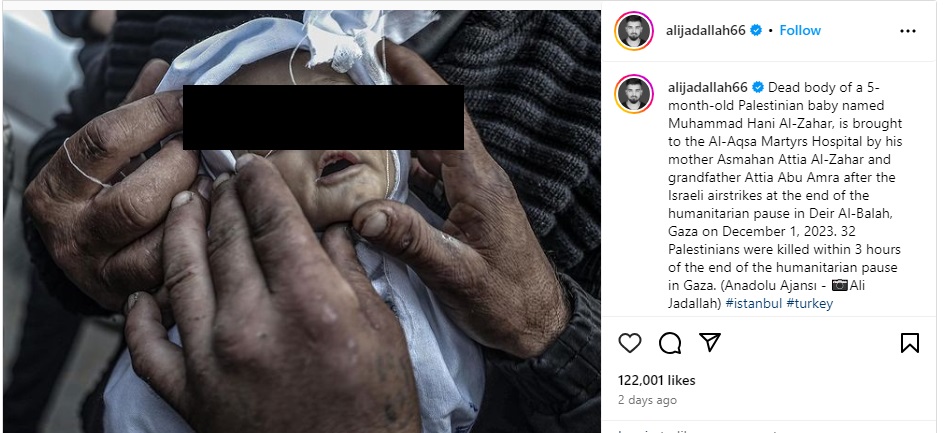 We also found an Instagram page of the photographer, which carried a similar photograph with the caption “Dead body of a 5-month-old Palestinian baby named Muhammad Hani Al-Zahar, is brought to the Al-Aqsa Martyrs Hospital by his mother Asmahan Attia Al-Zahar and grandfather Attia Abu Amra after the Israeli airstrikes at the end of the humanitarian pause in Deir Al-Balah, Gaza on December 1, 2023. 32 Palestinians were killed within 3 hours of the end of the humanitarian pause in Gaza.”