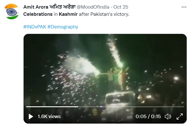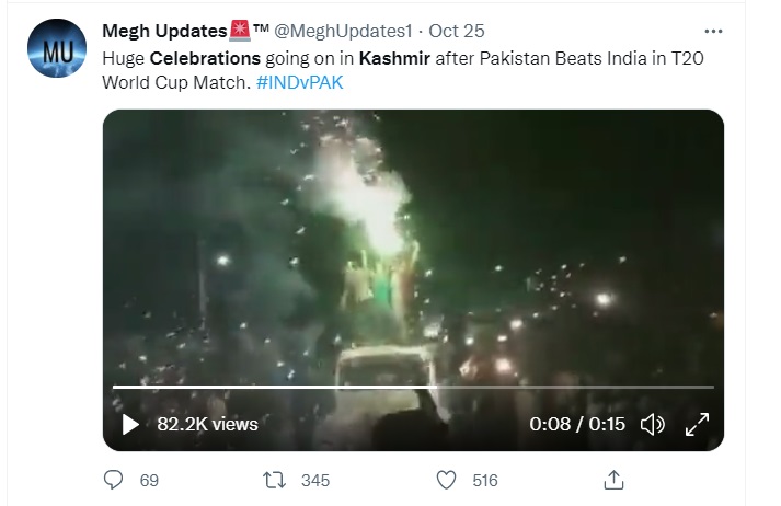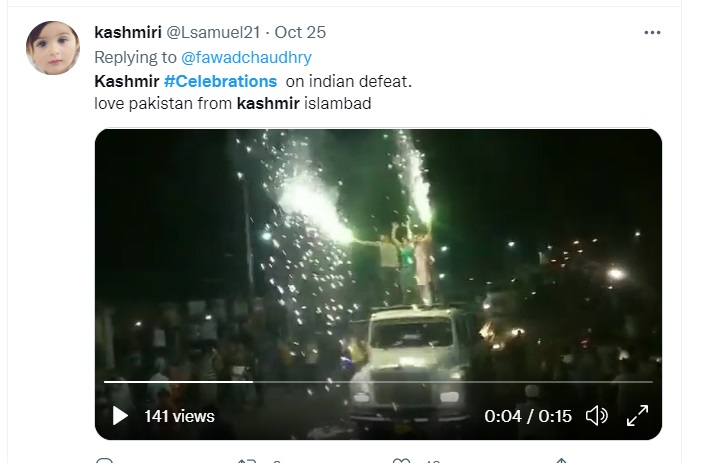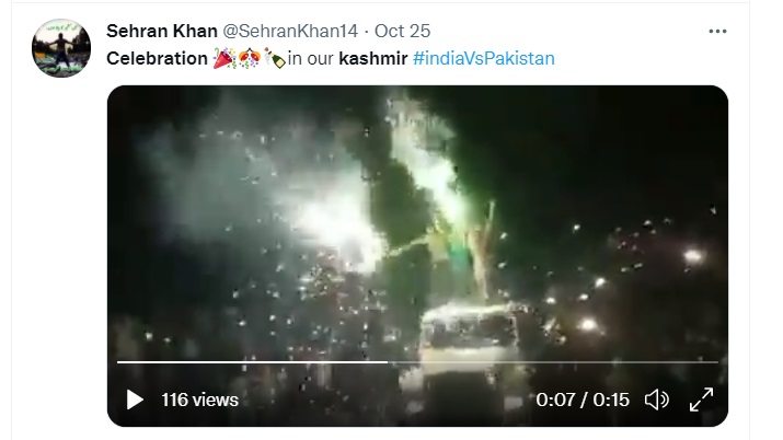 A 00:15 second long video claiming to be from Srinagar, allegedly showing Kashmiris celebrating Pakistan’s win has been widely shared after the match on Sunday. The post, shared by Twitter user @Sassy_Hindu has seen over 2,200 retweets and received over 4,000 likes. The same video was shared by many others and has gone viral.