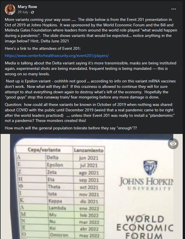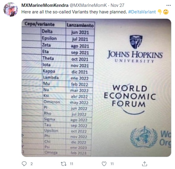 The viral image that shows tabular column with a list of Greek Alphabets and months written against them in sequence, carrying the logo of the WHO, WEF and the Johns Hopkins University placed on the document, does not indicate a ‘planned release of variants’ as is being claimed.