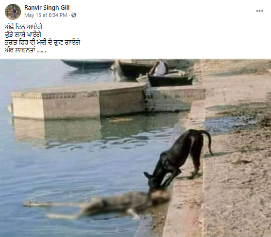 ਸੋਸ਼ਲ ਮੀਡੀਆ ਤੇ ਨਦੀ ਦੇ ਕਿਨਾਰੇ ਤੇ ਇੱਕ ਕੁੱਤਾ ਨਰ ਕੰਕਾਲ ਵਿੱਚ ਬਦਲ ਚੁੱਕੀ ਲਾਸ਼ ਨੂੰ ਨੋਚਦੇ ਹੋਈ ਦਿਖਾਈ ਦੇ ਰਿਹਾ ਹੈ ਵਾਇਰਲ ਹੋ ਰਹੀ ਤਸਵੀਰ ਨੂੰ Corona ਦੇ ਦੌਰ ਦਾ ਦੱਸਕੇ ਪ੍ਰਧਾਨ ਮੰਤਰੀ ਨਰਿੰਦਰ ਮੋਦੀ ਦੀ ਆਲੋਚਨਾ ਕੀਤੀ ਜਾ ਰਹੀ ਹੈ।