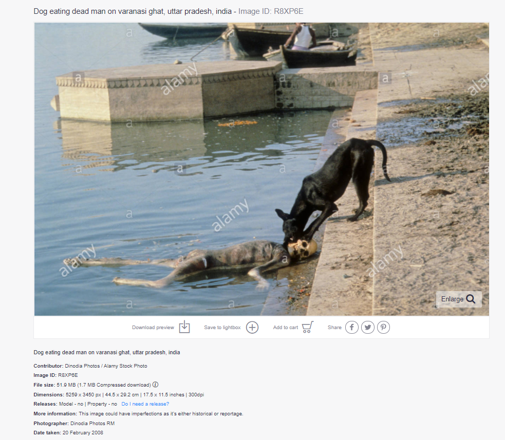 ਸਰਚ ਦੇ ਦੌਰਾਨ ਸਾਨੂੰ ਵਾਇਰਲ ਹੋ ਰਹੀ ਤਸਵੀਰ ਸਟਾਕ ਇਮੇਜ਼ ਵੈੱਬਸਾਈਟ Alamy ਤੇ ਮਿਲੀ। ਵੈੱਬਸਾਈਟ ਤੇ ਦਿੱਤੀ ਗਈ ਜਾਣਕਾਰੀ ਦੇ ਮੁਤਾਬਕ ਤਸਵੀਰ ਨੂੰ 20 ਫ਼ਰਵਰੀ 2008 ਨੂੰ ਬਨਾਰਸ ਦੇ ਘਾਟ ਤੇ ਲਿਆ ਗਿਆ ਸੀ ਜਦੋਂ ਇਹ ਕੁੱਤਾ ਇਕ ਲਾਸ਼ ਨੂੰ ਨੋਚ ਰਿਹਾ ਸੀ।