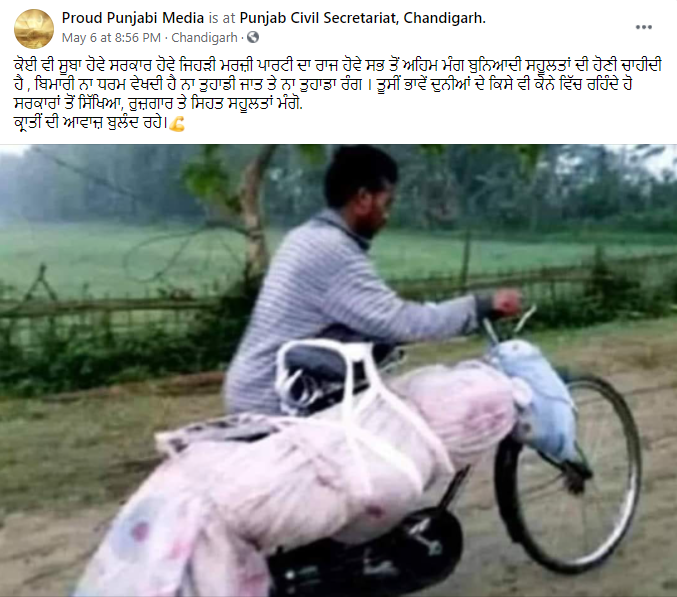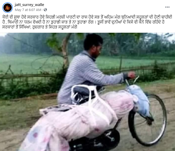 ਸੋਸ਼ਲ ਮੀਡੀਆ ਤੇ ਇਕ ਤਸਵੀਰ ਖੂਬ ਵਾਇਰਲ ਹੋ ਰਹੀ ਹੈ। ਤਸਵੀਰ ਵਿੱਚ ਇੱਕ ਵਿਅਕਤੀ ਨੂੰ ਆਪਣੀ ਸਾਈਕਲ (Cycle) ਦੇ ਉੱਤੇ ਮ੍ਰਿਤਕ ਦੇਹ ਨੂੰ ਲਿਜਾਂਦੇ ਦੇਖਿਆ ਜਾ ਸਕਦਾ। ਵਾਇਰਲ ਹੋ ਰਹੀ ਤਸਵੀਰ ਨੂੰ ਕਰੋਨਾ ਦੀ ਕਾਰਨ ਦੇਸ਼ ਵਿੱਚ ਪੈਦਾ ਹੋਏ ਹਾਲਾਤ ਨਾਲ ਜੋੜ ਕੇ ਸ਼ੇਅਰ ਕੀਤਾ ਜਾ ਰਿਹਾ ਹੈ।