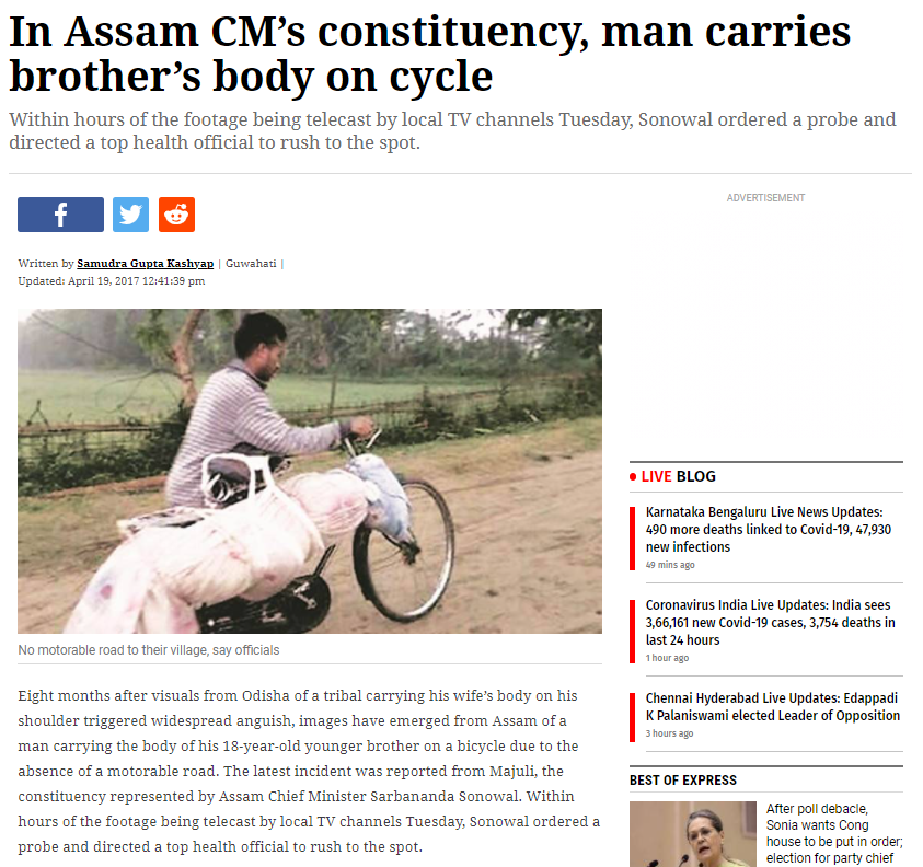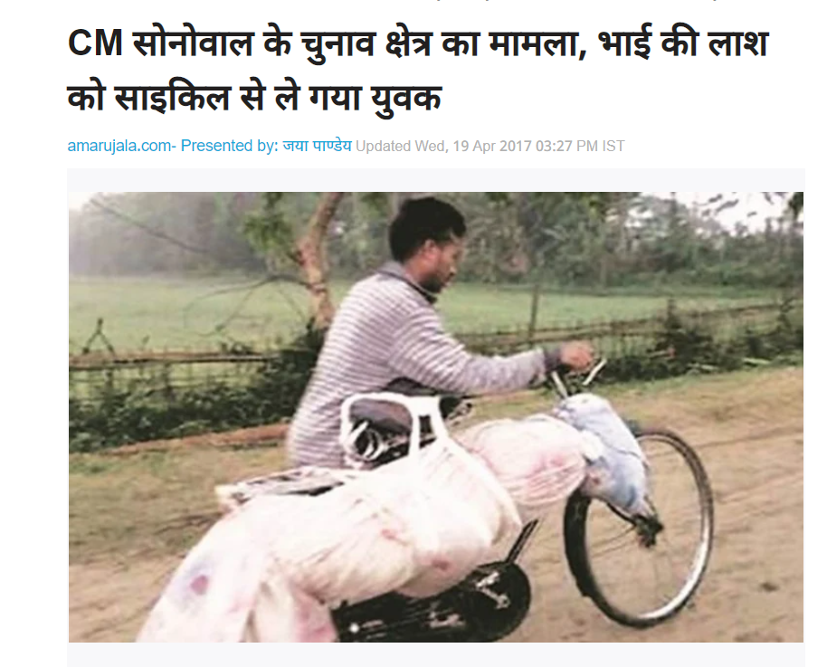 ਇੰਡੀਅਨ ਐਕਸਪ੍ਰੈਸ ਦੁਆਰਾ ਪ੍ਰਕਾਸ਼ਿਤ ਇਸ ਆਰਟੀਕਲ ਦੀ ਮੁਤਾਬਕ,ਅਸਾਮ ਦੇ ਸਾਬਕਾ ਮੁੱਖ ਮੰਤਰੀ ਸਰਬਨੰਦਾ ਸੋਨੋਵਾਲ ਦੇ ਵਿਧਾਨ ਸਭਾ ਹਲਕੇ ਵਿੱਚ ਇੱਕ ਵਿਅਕਤੀ ਆਪਣੇ ਭਰਾ ਦੀ ਮ੍ਰਿਤਕ ਦੇਹ ਨੂੰ ਸਾਈਕਲ ਤੇ ਲੈ ਕੇ ਗਿਆ ਸੀ। ਮਾਮਲਾ ਦੇ ਭੜਕਣ ਤੋਂ ਬਾਅਦ ਅਫ਼ਸਰਾਂ ਵੱਲੋਂ ਜਾਂਚ ਕੀਤੀ ਗਈ । ਜਾਂਚ ਵਿਚ ਪਾਇਆ ਕਿ ਲਾਸ਼ ਨੂੰ ਜਿਹੜੇ ਰਸਤੇ ਰਾਹੀਂ ਲਿਜਾਇਆ ਜਾ ਰਿਹਾ ਸੀ ਉਸ ਰਸਤੇ ਤੋਂ ਕੋਈ ਬਾਈਕ ਜਾਂ ਕਾਰ ਨਹੀਂ ਲੰਘ ਸਕਦੀ ਸੀ।