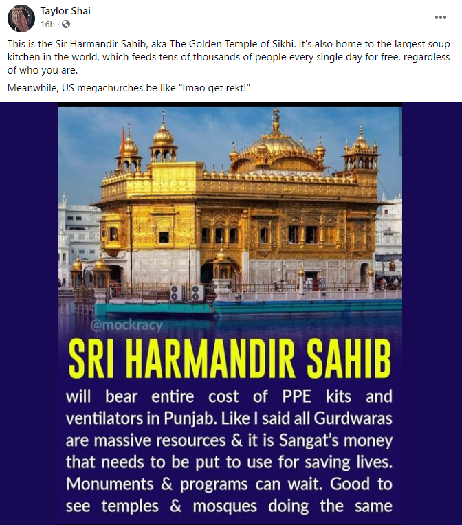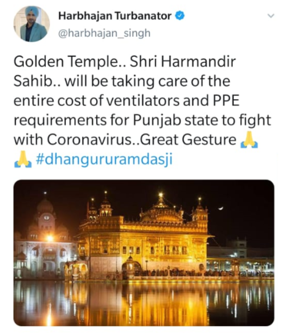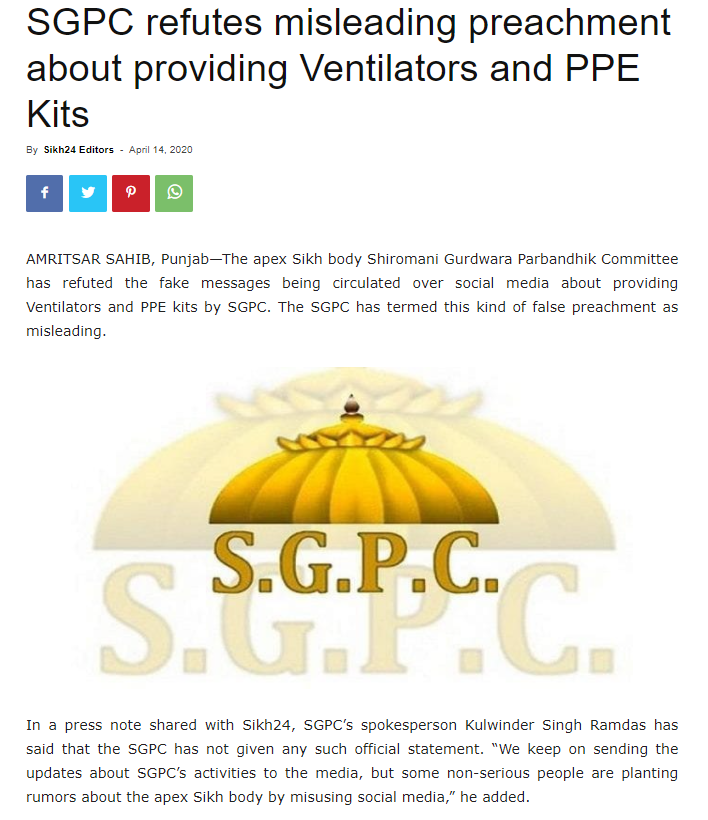 ਕੋਰੋਨਾਵਾਇਰਸ ਖ਼ਿਲਾਫ਼ ਲੜਾਈ ਵਿੱਚ ਹਰ ਕੋਈ ਆਪਣੀ ਲੋੜਵੰਦਾਂ ਦੀ ਮਦਦ ਕਰ ਰਿਹਾ ਹੈ। ਵੱਖ ਵੱਖ NGO , ਕਾਰਕੁਨਾਂ ਅਤੇ ਦਿੱਲੀ ਸਿੱਖ ਗੁਰੁਦਆਰਾ ਪ੍ਰਬੰਧਕ ਕਮੇਟੀ ਦੇ ਵਲੋਂ ਥਾਂ ਥਾਂ ਤੇ ਲੰਗਰ ਲਗਾਏ ਗਏ ਹਨ। ਇਸ ਦੌਰਾਨ ਸੋਸ਼ਲ ਮੀਡੀਆ ਤੇ ਇੱਕ ਖਬਰ ਵਾਇਰਲ ਹੋ ਰਹੀ ਹੈ ਜਿਸ ਨਾਲ ਦਾਅਵਾ ਕੀਤਾ ਜਾ ਰਿਹਾ ਹੈ ਕਿ ਸ੍ਰੀ ਦਰਬਾਰ ਸਾਹਿਬ, ਅੰਮ੍ਰਿਤਸਰ ਵਲੋਂ ਪੂਰੇ ਪੰਜਾਬ ਵਿੱਚ ਵੈਨਟੀਲੇਟਰਾਂ ਅਤੇ ਪੀਪੀਈ ਕਿੱਟਾਂ (PPE Kits) ਦਾ ਸਾਰਾ ਖ਼ਰਚਾ ਚੁਕਿਆ ਜਾਵੇਗਾ।